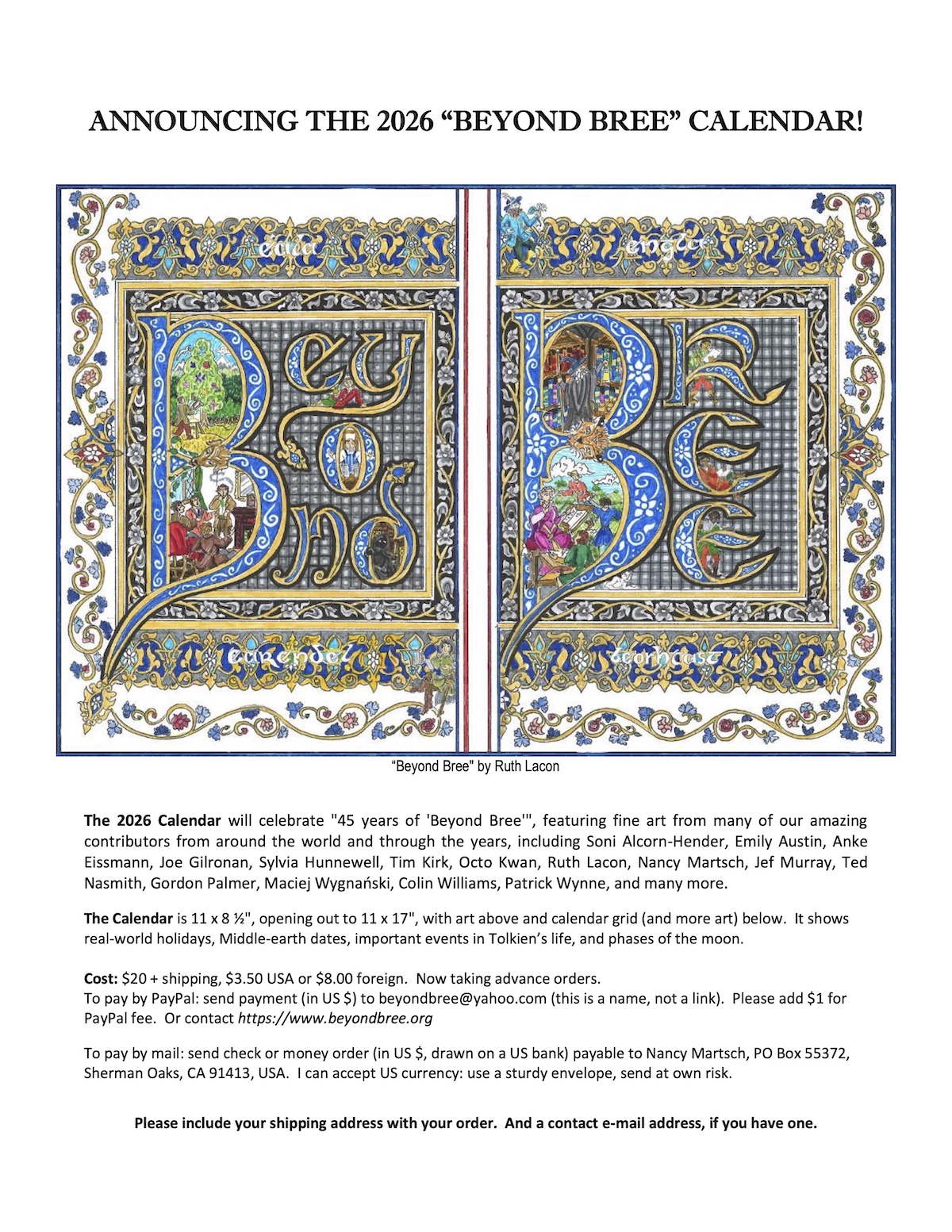 "Beyond Bree," newsletter of the JRR Tolkien Special Interest Group of American Mensa, celebrated its 30th Anniversary in March, 2011, with a special oversize full-colour issue, featuring a cover illustration by Ted Nasmith. Copies are still available.
